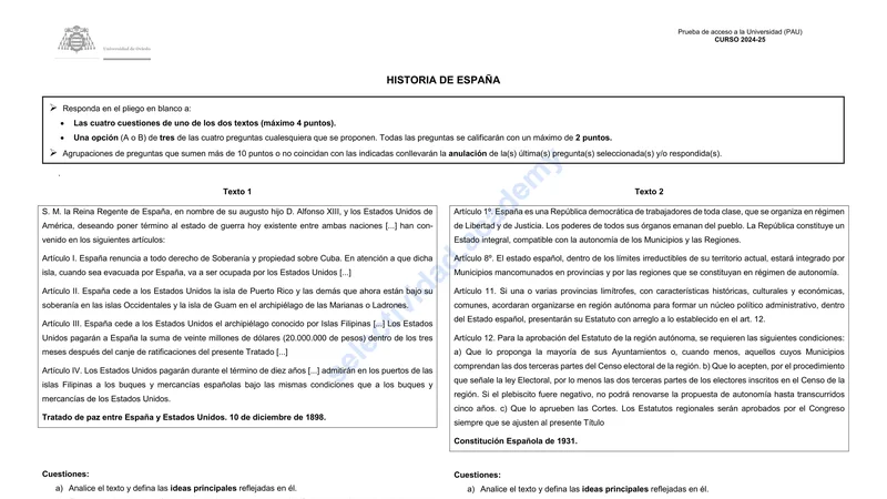 Reservar clase gratis →Examen de Historia de España selectividad Asturias (Ordinaria 2025)