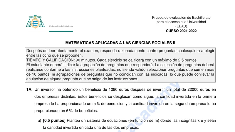 Reservar clase gratis →Examen de Matemáticas Aplicadas CCSS selectividad Asturias (Ordinaria 2022)