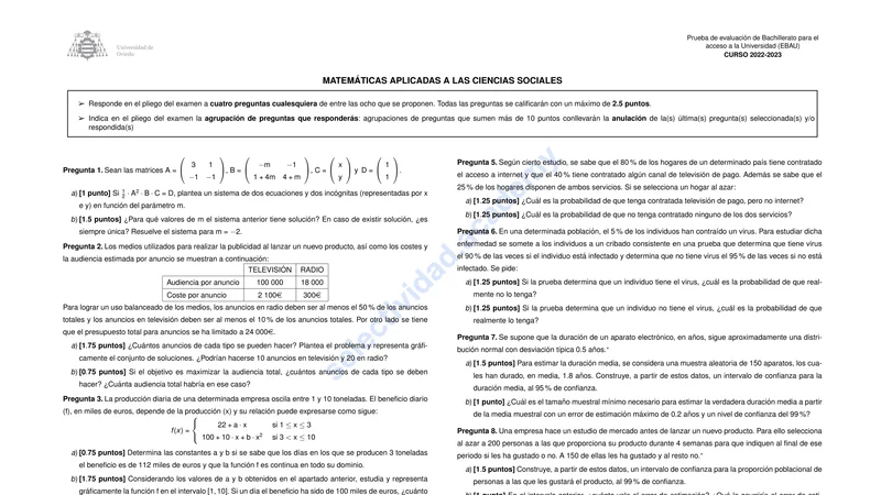 Examen de Matemáticas Aplicadas CCSS selectividad Asturias — Ordinaria 2023