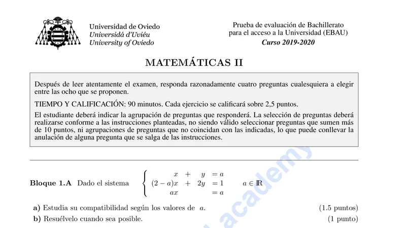Reservar clase gratis →Examen de Matemáticas II selectividad Asturias (Extraordinaria 2020)