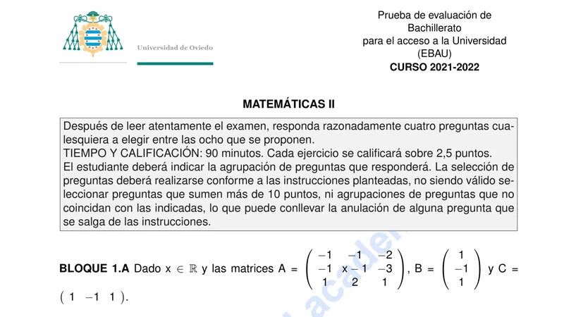 Examen de Matemáticas II selectividad Asturias — Extraordinaria 2022
