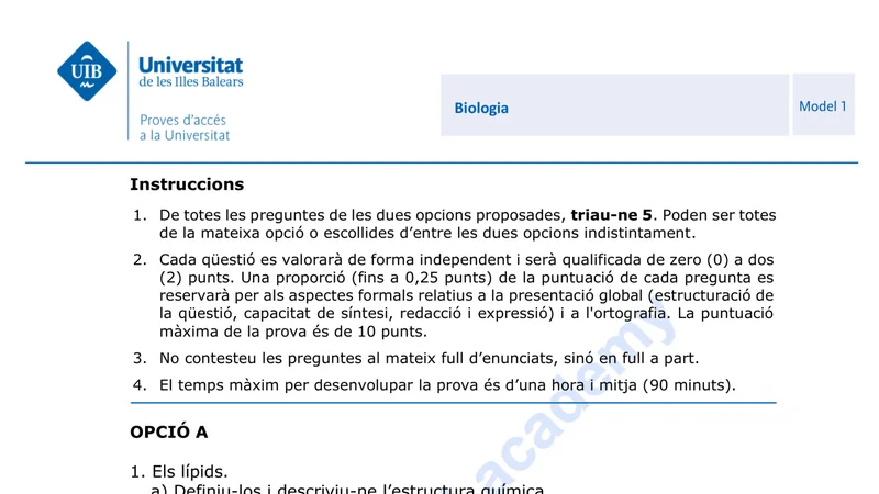 Enunciado oficial del examen de Biología de la convocatoria extraordinaria de 2024 de la PBAU/PAU de Islas Baleares. PDF de 0.1 MB. Descarga gratuita y sin registro. ¿Preparando la selectividad? Calcula tu nota estimada o consulta la guía completa de selectividad 2026. Encuentra todos los exámenes de Biología en Islas Baleares o explora las 17 comunidades autónomas.
