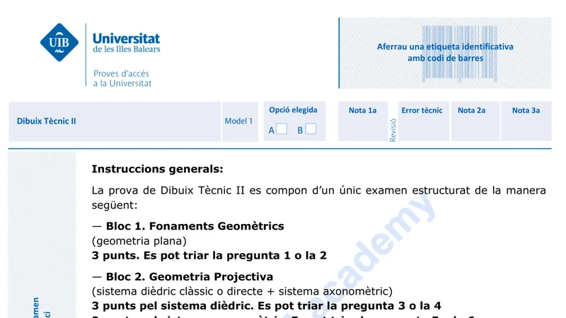 Enunciado oficial del examen de Dibujo Técnico II de la convocatoria extraordinaria de 2025 de la PBAU/PAU de Islas Baleares. PDF de 0.5 MB. Descarga gratuita y sin registro. ¿Preparando la selectividad? Calcula tu nota estimada o consulta la guía completa de selectividad 2026. Encuentra todos los exámenes de Dibujo Técnico II en Islas Baleares o explora las 17 comunidades autónomas.
