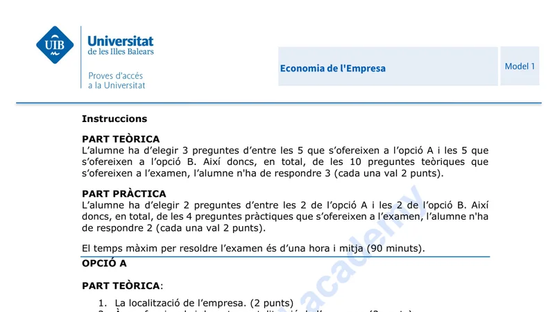 Enunciado oficial del examen de Economía de la Empresa de la convocatoria ordinaria de 2023 de la PBAU/PAU de Islas Baleares. PDF de 0.3 MB. Descarga gratuita y sin registro. ¿Preparando la selectividad? Calcula tu nota estimada o consulta la guía completa de selectividad 2026. Encuentra todos los exámenes de Economía de la Empresa en Islas Baleares o explora las 17 comunidades autónomas.