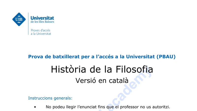 Enunciado oficial del examen de Historia de la Filosofía de la convocatoria ordinaria de 2022 de la PBAU/PAU de Islas Baleares. PDF de 0.1 MB. Descarga gratuita y sin registro. ¿Preparando la selectividad? Calcula tu nota estimada o consulta la guía completa de selectividad 2026. Encuentra todos los exámenes de Historia de la Filosofía en Islas Baleares o explora las 17 comunidades autónomas.