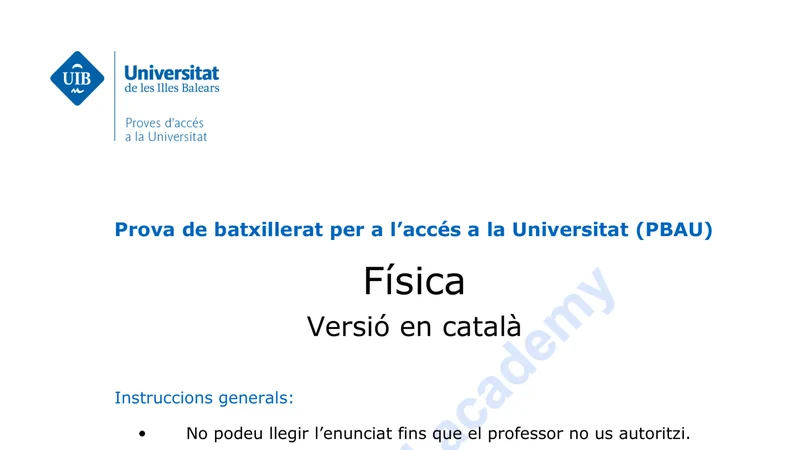 Enunciado oficial del examen de Física de la convocatoria ordinaria de 2022 de la PBAU/PAU de Islas Baleares. PDF de 0.3 MB. Descarga gratuita y sin registro. ¿Preparando la selectividad? Calcula tu nota estimada o consulta la guía completa de selectividad 2026. Encuentra todos los exámenes de Física en Islas Baleares o explora las 17 comunidades autónomas.
