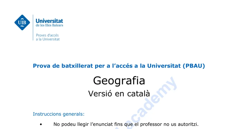 Enunciado oficial del examen de Geografía de la convocatoria extraordinaria de 2022 de la PBAU/PAU de Islas Baleares. PDF de 0.8 MB. Descarga gratuita y sin registro. ¿Preparando la selectividad? Calcula tu nota estimada o consulta la guía completa de selectividad 2026. Encuentra todos los exámenes de Geografía en Islas Baleares o explora las 17 comunidades autónomas.
