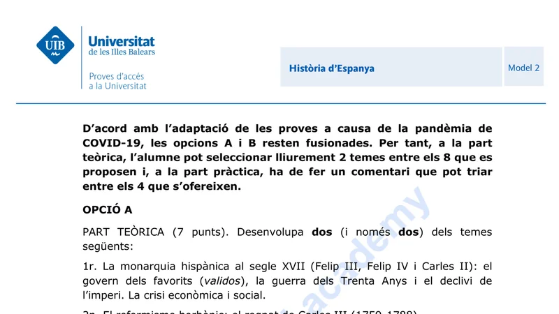 Examen de Historia de España selectividad Islas Baleares — Ordinaria 2020
