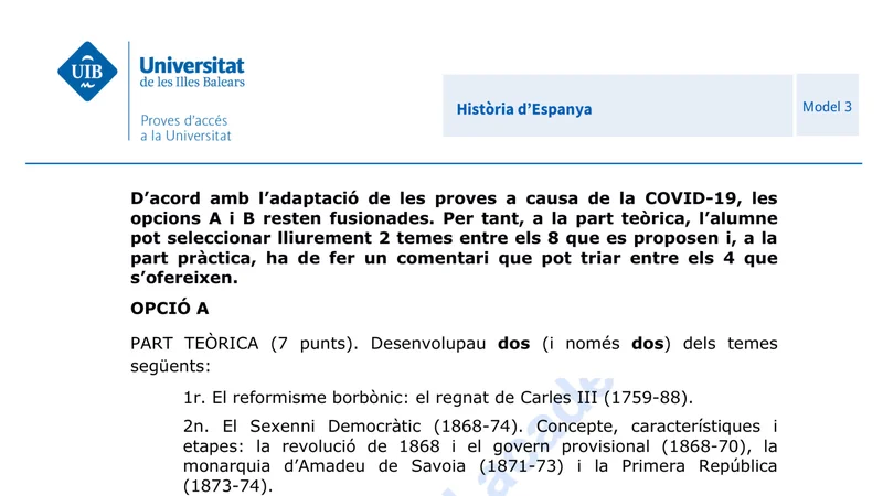 Examen de Historia de España selectividad Islas Baleares — Ordinaria 2021