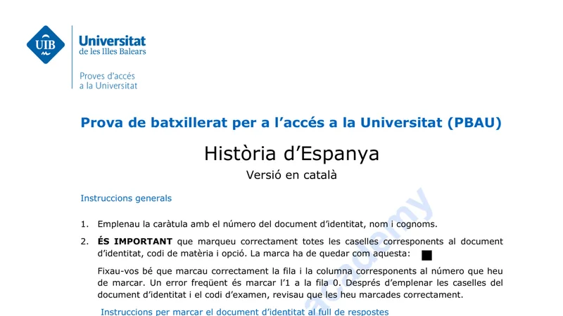 Enunciado oficial del examen de Historia de España de la convocatoria ordinaria de 2022 de la PBAU/PAU de Islas Baleares. PDF de 0.1 MB. Descarga gratuita y sin registro. ¿Preparando la selectividad? Calcula tu nota estimada o consulta la guía completa de selectividad 2026. Encuentra todos los exámenes de Historia de España en Islas Baleares o explora las 17 comunidades autónomas.