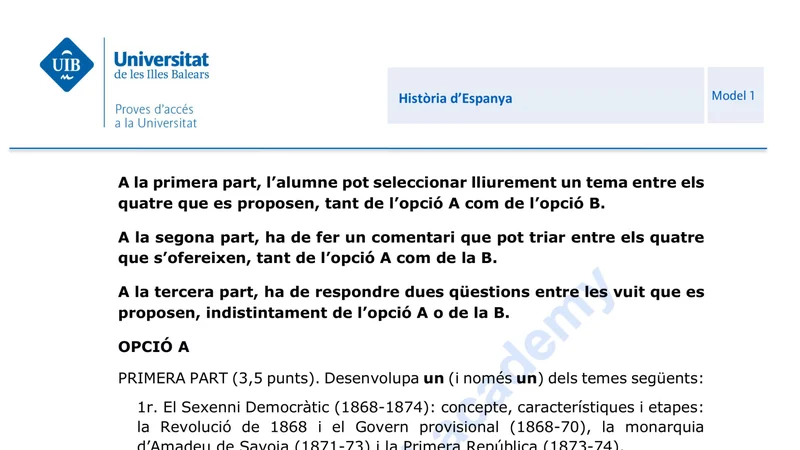 Reservar clase gratis →Examen de Historia de España selectividad Islas Baleares (Extraordinaria 2024)