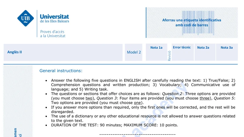 Enunciado oficial del examen de Inglés de la convocatoria ordinaria de 2025 de la PBAU/PAU de Baleares. PDF de 0.3 MB. Descarga gratuita y sin registro. ¿Preparando la selectividad? Calcula tu nota estimada o consulta la guía completa de selectividad 2026. Encuentra todos los exámenes de Inglés en Baleares o explora las 17 comunidades autónomas.