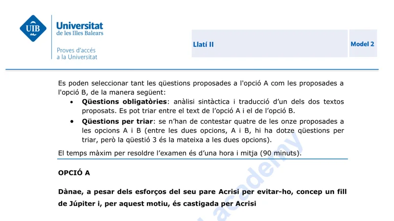 Enunciado oficial del examen de Latín II de la convocatoria ordinaria de 2024 de la PBAU/PAU de Islas Baleares. PDF de 0.2 MB. Descarga gratuita y sin registro. ¿Preparando la selectividad? Calcula tu nota estimada o consulta la guía completa de selectividad 2026. Encuentra todos los exámenes de Latín II en Islas Baleares o explora las 17 comunidades autónomas.
