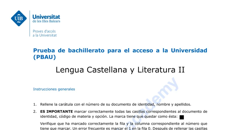 Enunciado oficial del examen de Lengua Castellana y Literatura de la convocatoria extraordinaria de 2022 de la PBAU/PAU de Islas Baleares. PDF de 0.2 MB. Descarga gratuita y sin registro. ¿Preparando la selectividad? Calcula tu nota estimada o consulta la guía completa de selectividad 2026. Encuentra todos los exámenes de Lengua Castellana y Literatura en Islas Baleares o explora las 17 comunidades autónomas.