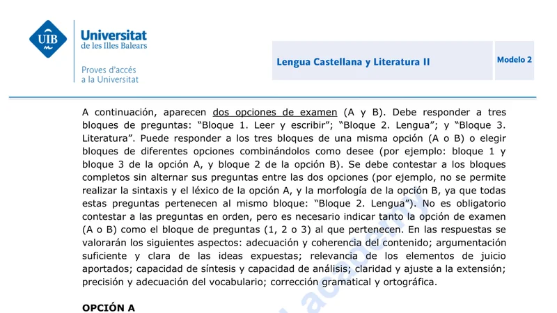 Enunciado oficial del examen de Lengua Castellana y Literatura de la convocatoria ordinaria de 2024 de la PBAU/PAU de Islas Baleares. PDF de 0.1 MB. Descarga gratuita y sin registro. ¿Preparando la selectividad? Calcula tu nota estimada o consulta la guía completa de selectividad 2026. Encuentra todos los exámenes de Lengua Castellana y Literatura en Islas Baleares o explora las 17 comunidades autónomas.