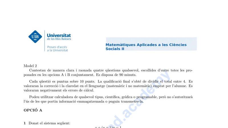 Enunciado oficial del examen de Matemáticas Aplicadas CCSS de la convocatoria ordinaria de 2020 de la PBAU/PAU de Islas Baleares. PDF de 0.7 MB. Descarga gratuita y sin registro. ¿Preparando la selectividad? Calcula tu nota estimada o consulta la guía completa de selectividad 2026. Encuentra todos los exámenes de Matemáticas Aplicadas CCSS en Islas Baleares o explora las 17 comunidades autónomas.