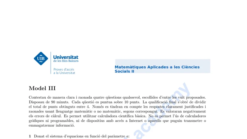 Enunciado oficial del examen de Matemáticas Aplicadas CCSS de la convocatoria ordinaria de 2021 de la PBAU/PAU de Islas Baleares. PDF de 1.0 MB. Descarga gratuita y sin registro. ¿Preparando la selectividad? Calcula tu nota estimada o consulta la guía completa de selectividad 2026. Encuentra todos los exámenes de Matemáticas Aplicadas CCSS en Islas Baleares o explora las 17 comunidades autónomas.