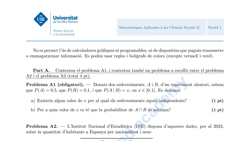 Examen de Matemáticas Aplicadas CCSS selectividad Islas Baleares — Extraordinaria 2025
