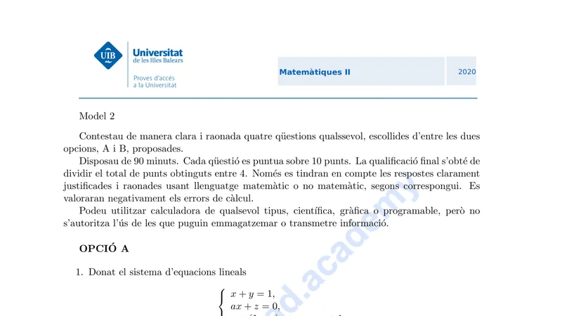 Enunciado oficial del examen de Matemáticas II de la convocatoria ordinaria de 2020 de la PBAU/PAU de Islas Baleares. PDF de 0.4 MB. Descarga gratuita y sin registro. ¿Preparando la selectividad? Calcula tu nota estimada o consulta la guía completa de selectividad 2026. Encuentra todos los exámenes de Matemáticas II en Islas Baleares o explora las 17 comunidades autónomas.