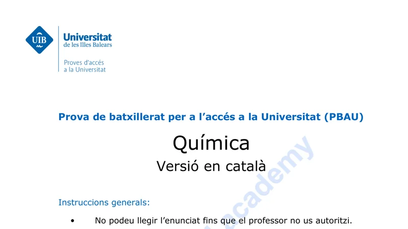 Enunciado oficial del examen de Química de la convocatoria ordinaria de 2022 de la PBAU/PAU de Islas Baleares. PDF de 0.3 MB. Descarga gratuita y sin registro. ¿Preparando la selectividad? Calcula tu nota estimada o consulta la guía completa de selectividad 2026. Encuentra todos los exámenes de Química en Islas Baleares o explora las 17 comunidades autónomas.