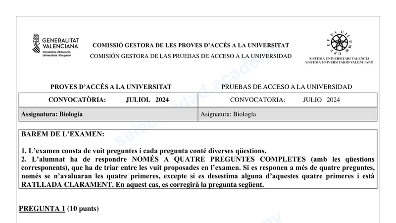 Examen de Biología selectividad C. Valenciana — Extraordinaria 2024