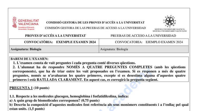 Reservar clase gratis →Examen de Biología selectividad C. Valenciana (Ordinaria 2024)