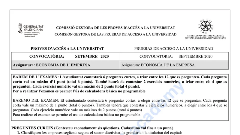 Reservar clase gratis →Examen de Economía selectividad C. Valenciana (Ordinaria 2020)