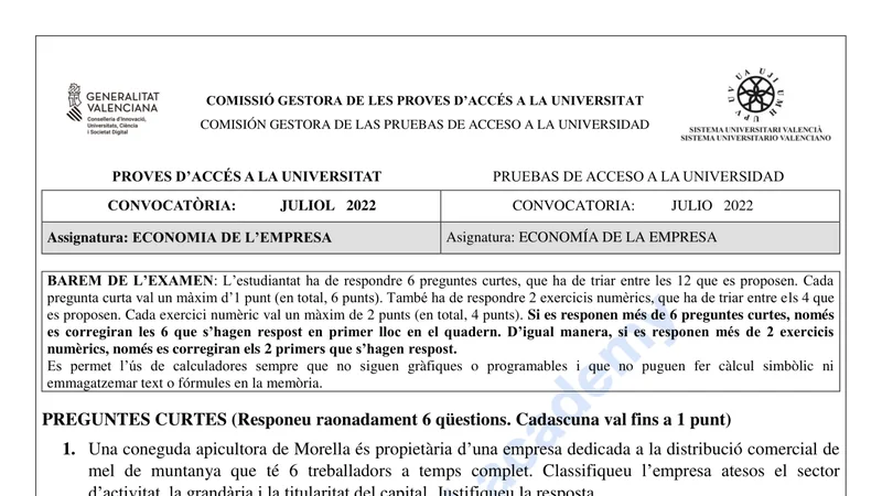 Examen de Economía de la Empresa selectividad C. Valenciana — Ordinaria 2022