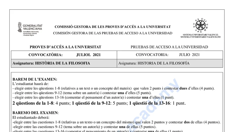 Examen de Historia de la Filosofía selectividad C. Valenciana — Ordinaria 2021