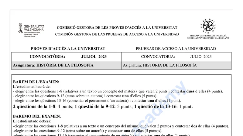 Examen de Historia de la Filosofía selectividad C. Valenciana — Ordinaria 2023