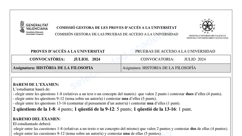 Examen de Historia de la Filosofía selectividad C. ValencianaExtraordinaria 2024