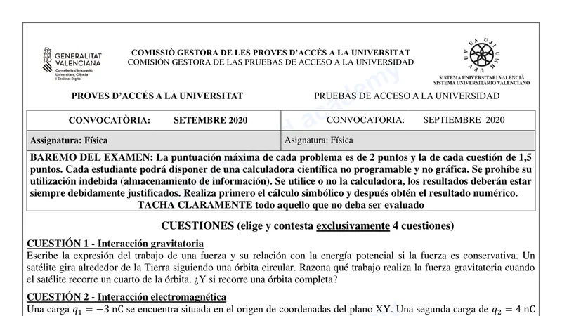 Examen PAU Física selectividad C. Valenciana — Extraordinaria 2020