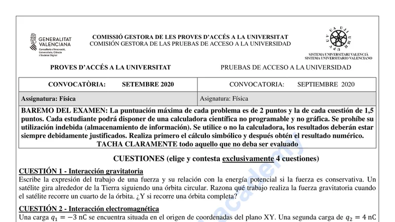 Examen PAU Física selectividad C. Valenciana — Ordinaria 2020