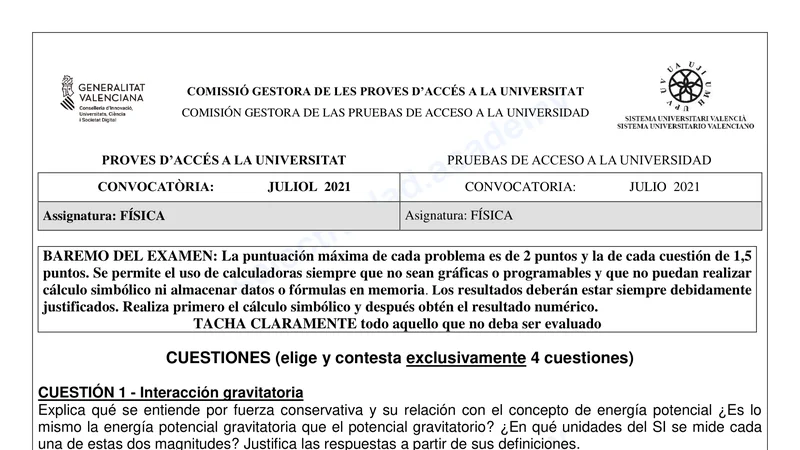 Examen PAU Física selectividad C. Valenciana — Extraordinaria 2021