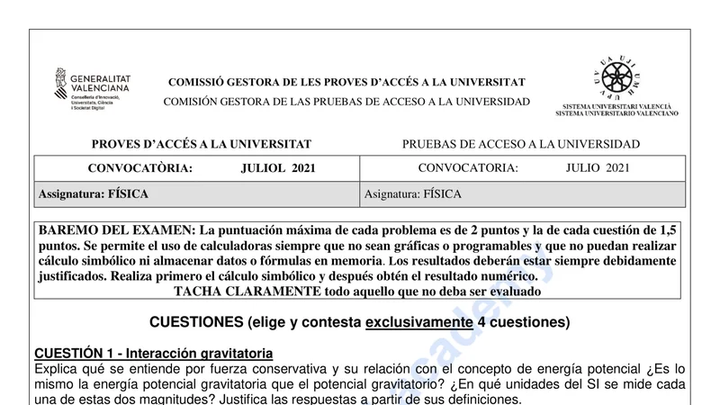 Examen PAU Física selectividad C. Valenciana — Ordinaria 2021