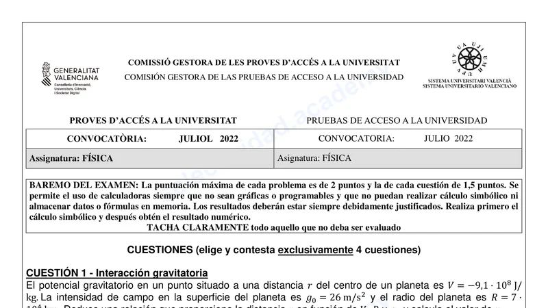 Examen PAU Física selectividad C. Valenciana — Extraordinaria 2022