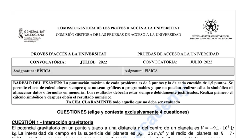 Examen PAU Física selectividad C. Valenciana — Ordinaria 2022