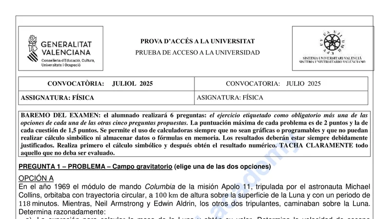 Reservar clase gratis →Examen de Física selectividad C. Valenciana (Extraordinaria 2025)