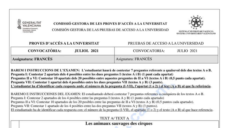 Reservar clase gratis →Examen de Francés selectividad C. Valenciana (Extraordinaria 2021)