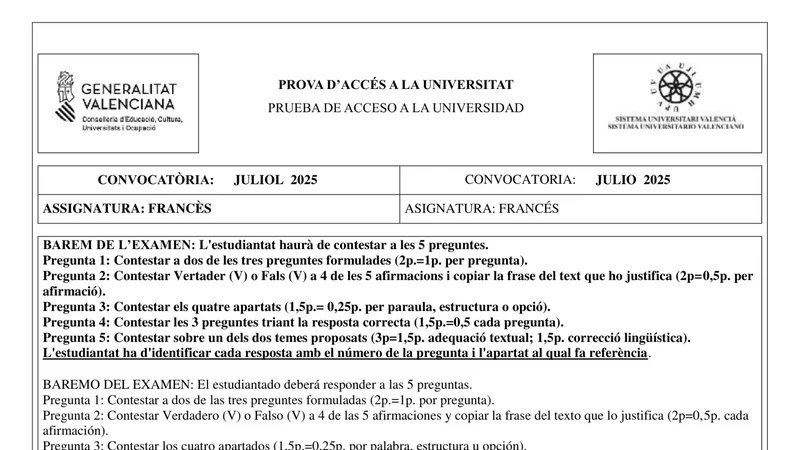 Examen de Francés selectividad C. Valenciana — Extraordinaria 2025