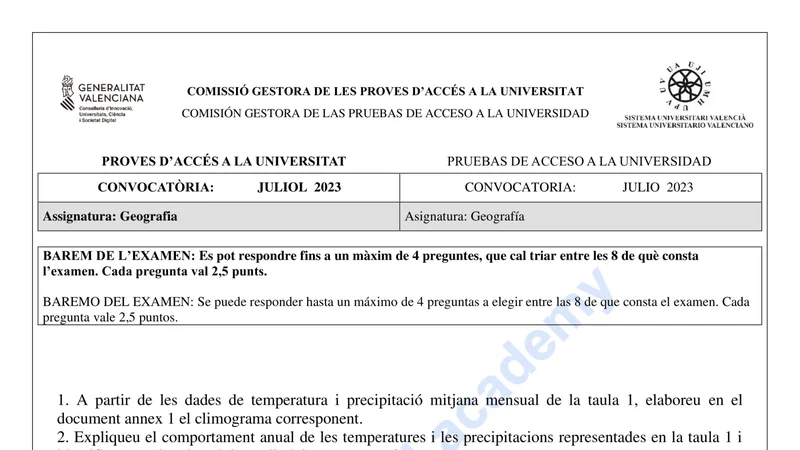 Examen de Geografía selectividad C. Valenciana — Ordinaria 2023