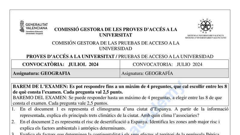 Reservar clase gratis →Examen de Geografía selectividad C. Valenciana (Extraordinaria 2024)