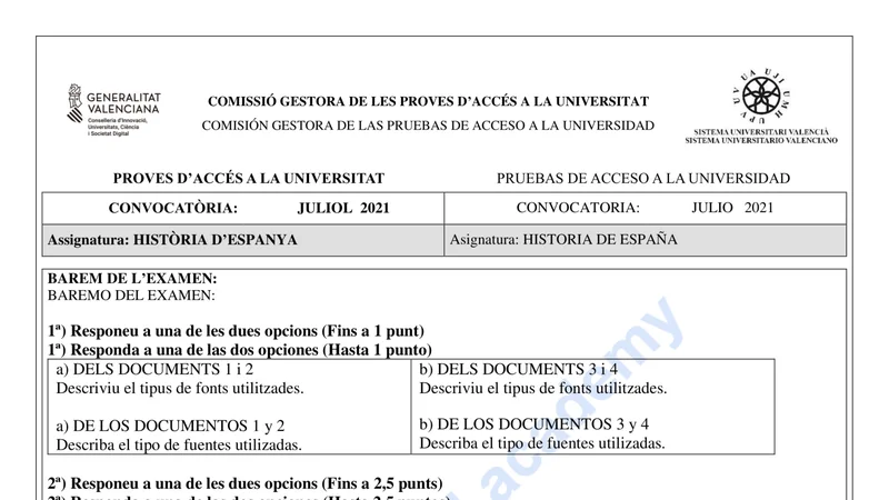 Examen de Historia de España selectividad C. Valenciana — Ordinaria 2021