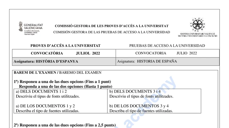 Reservar clase gratis →Examen de Historia de España selectividad C. Valenciana (Ordinaria 2022)