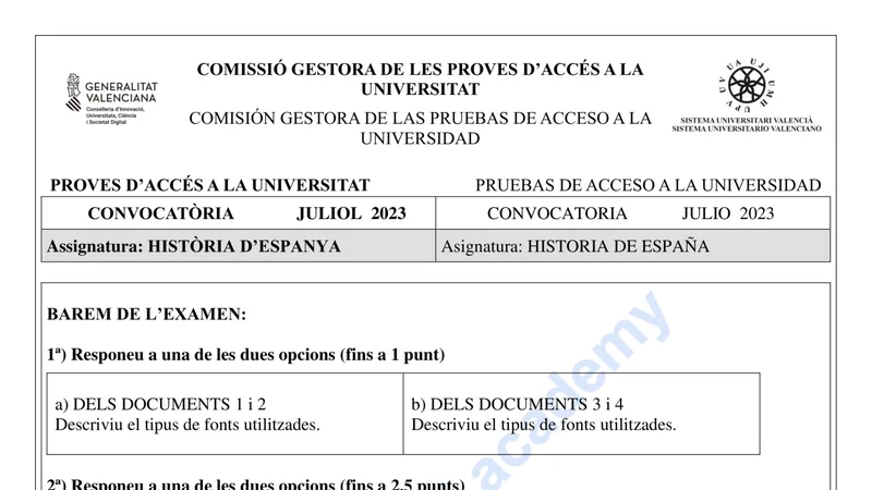 Examen PAU Historia de España selectividad C. Valenciana — Ordinaria 2023