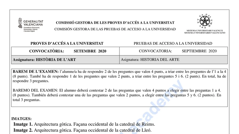 Examen PAU Historia del Arte selectividad C. Valenciana — Extraordinaria 2020