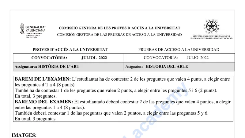 Examen PAU Historia del Arte selectividad C. Valenciana — Extraordinaria 2022