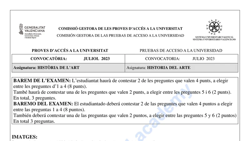 Examen PAU Historia del Arte selectividad C. Valenciana — Ordinaria 2023