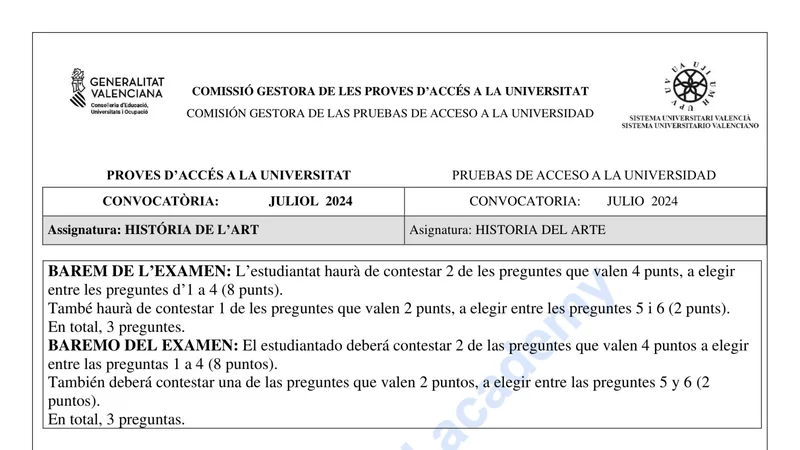 Examen de Historia del Arte selectividad C. Valenciana — Extraordinaria 2024
