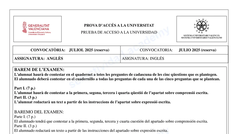 Reservar clase gratis →Examen de Inglés selectividad C. Valenciana (Extraordinaria 2025)
